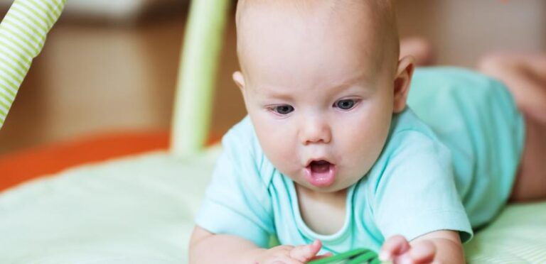 For early tummy time, when your baby is just getting able to lift their head up steady for a few seconds and can reach a little with their arms, either on the floor or with their chest supported by a nursing pillow or a rolled blanket: